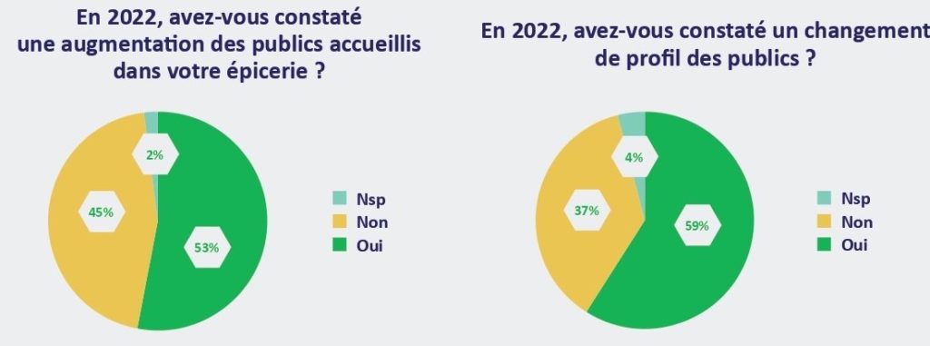 53 % des épiceries constatent une hausse des publics accueillis (de l’ordre de 20 %) avec notamment l’apparition d’un public retraité, étudiant et de travailleurs précaires qui, face à la hausse de coûts de l’énergie et de l’alimentation, voient leur situation basculer. Soulignons en parallèle la surreprésentation bien connue désormais d’un public mineur de moins de 15 ans (30 % des publics des épiceries pour 17 % de la population) qui confirme que cette population est bien plus vulnérable face à la précarité.